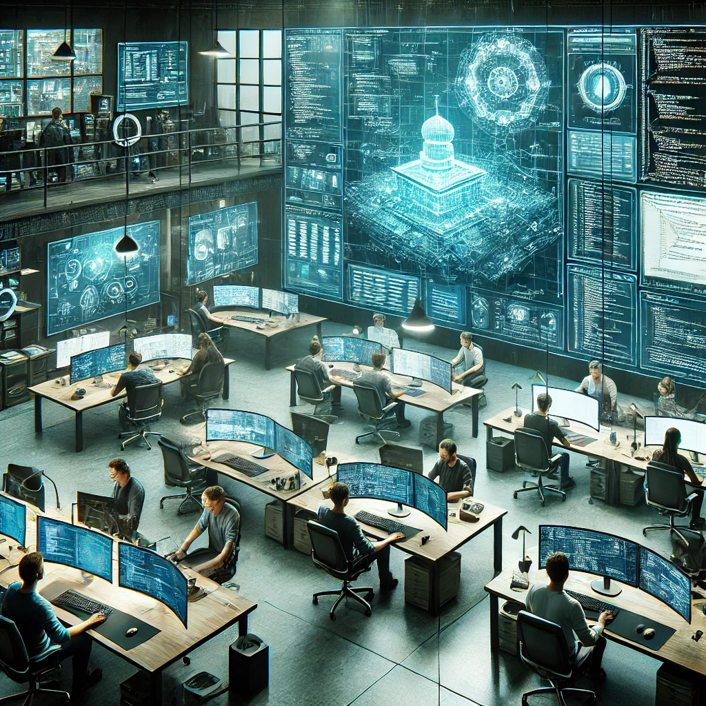 ایجاد یک استودیو توسعه پیشرفته با همکاری توسعهدهندگان بر روی چندین صفحه نمایش که کدهای پیچیده و ابزارهای مدیریت پروژه را نمایش میدهند.