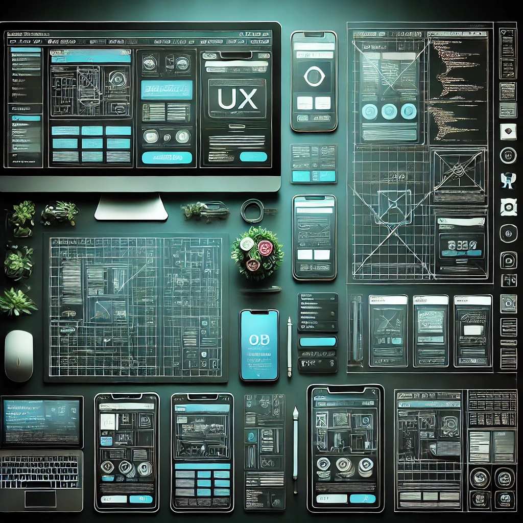 نمایی جامع از فرآیند توسعه اپلیکیشن موبایل، شامل وایرفریمها، طراحی UI/UX و قطعات کد بر روی چندین دستگاه.